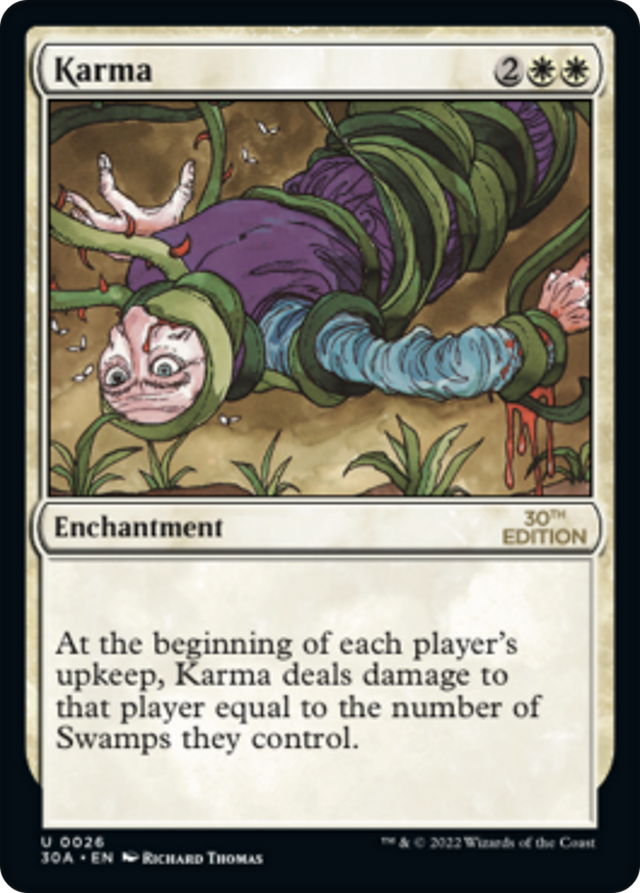 At the beginning of each player's upkeep, Karma deals damage to that player equal to the number of Swamps they control.