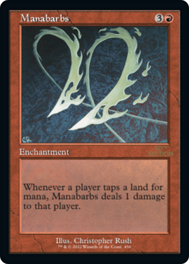 Whenever a player taps a land for mana, Manabarbs deals 1 damage to that player.