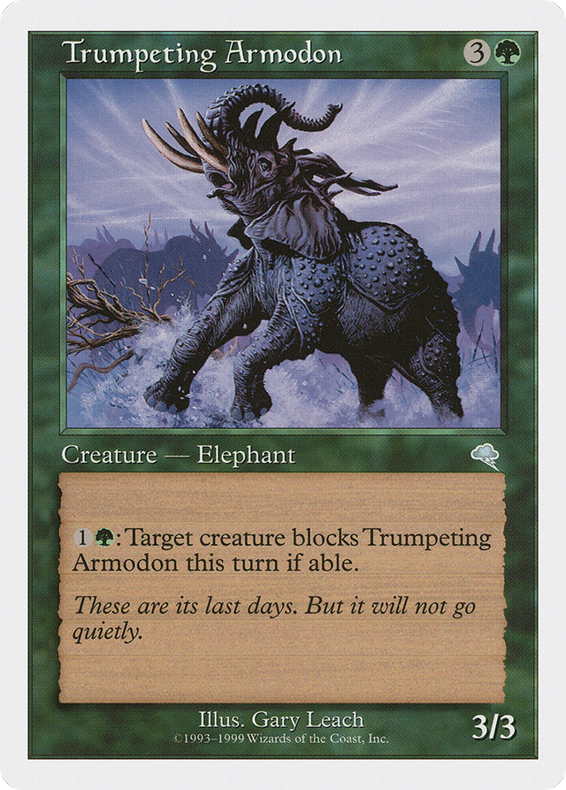 {1}{G}: Target creature blocks Trumpeting Armodon this turn if able.
