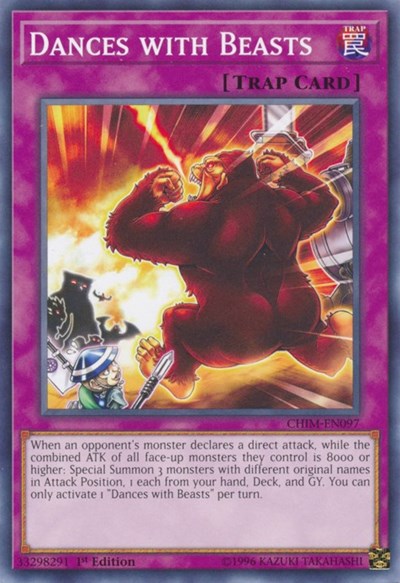When an opponent's monster declares a direct attack, while the combined ATK of all face-up monsters they control is 8000 or higher: Special Summon 3 monsters with different original names in Attack Position, 1 each from your hand, Deck, and GY. You can only activate 1 "Dances with Beasts" per turn.