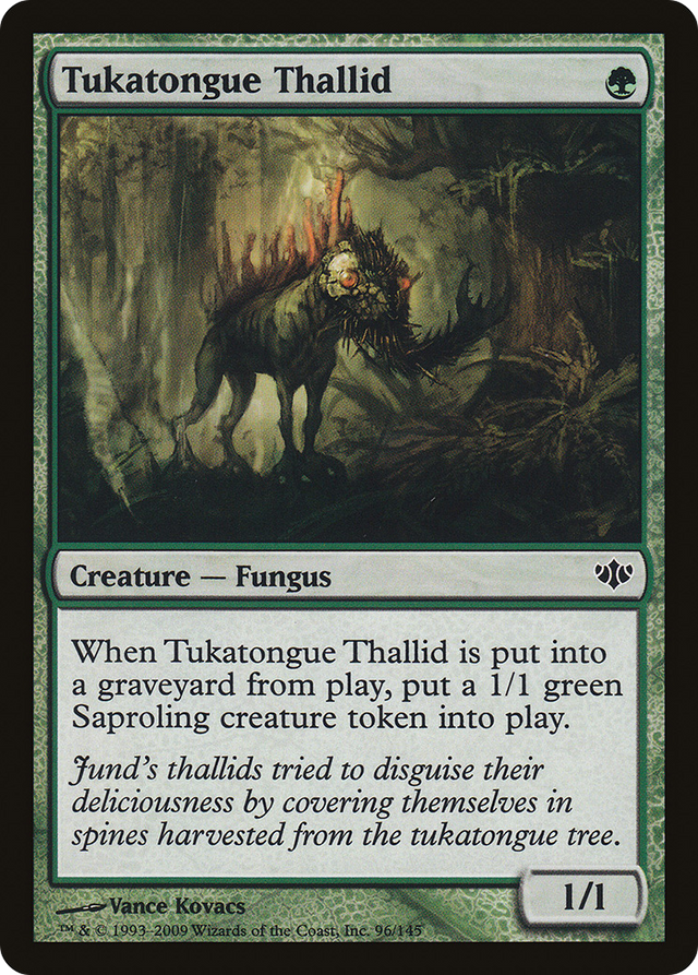 When Tukatongue Thallid dies, create a 1/1 green Saproling creature token.