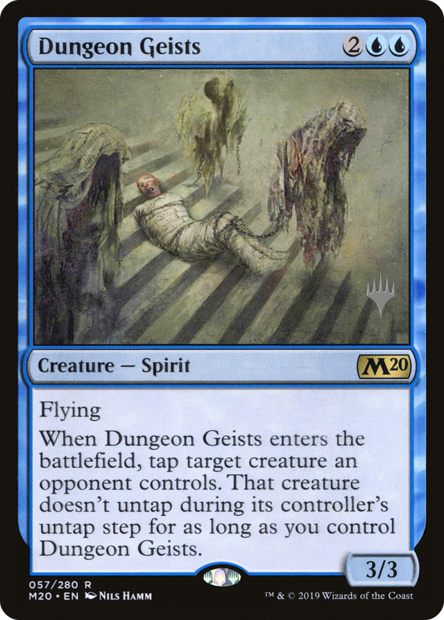 When Dungeon Geists enters the battlefield, tap target creature an opponent controls. That creature doesn't untap during its controller's untap step for as long as you control Dungeon Geists.