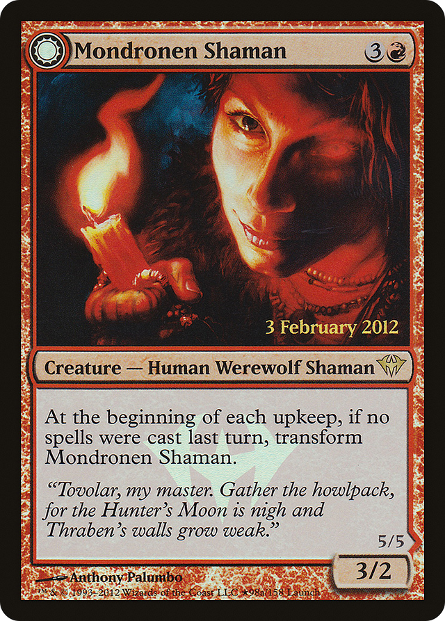 At the beginning of each upkeep, if no spells were cast last turn, transform Mondronen Shaman. // Whenever an opponent casts a spell, Tovolar's Magehunter deals 2 damage to that player. At the beginning of each upkeep, if a player cast two or more spells last turn, transform Tovolar's Magehunter.