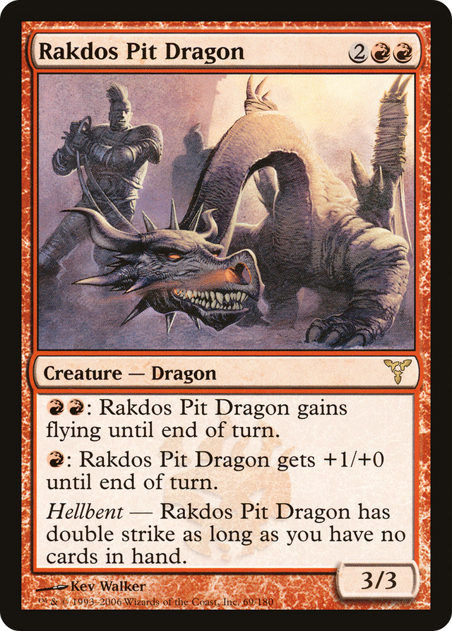 Hellbent — Rakdos Pit Dragon has double strike as long as you have no cards in hand.