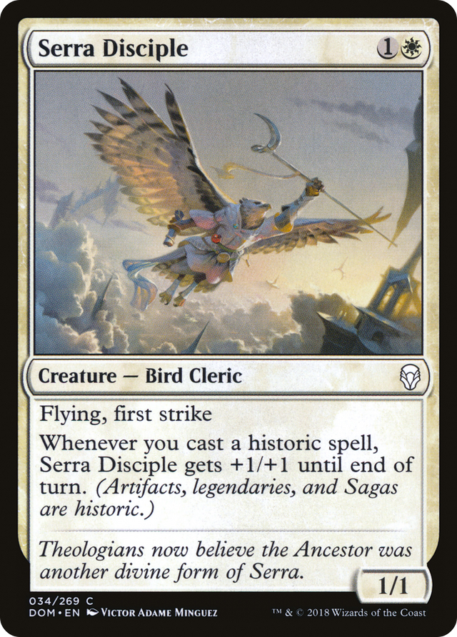 Whenever you cast a historic spell, Serra Disciple gets +1/+1 until end of turn. (Artifacts, legendaries, and Sagas are historic.)