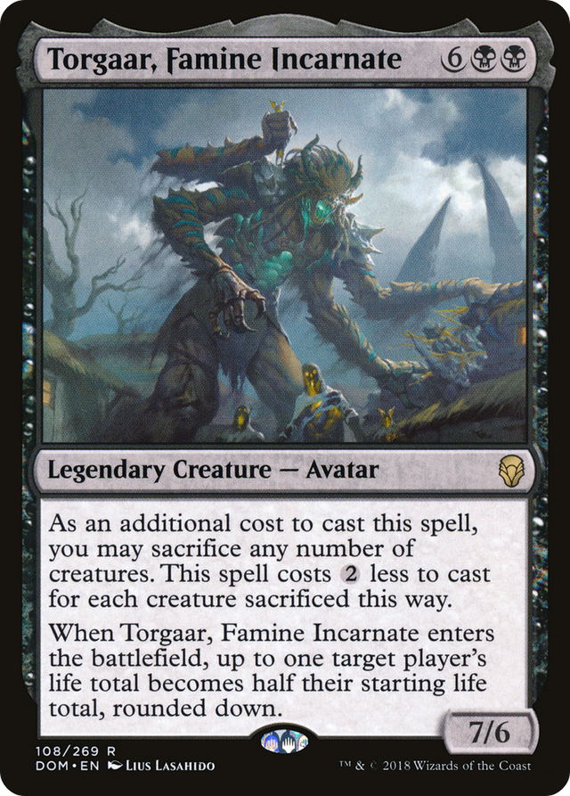 When Torgaar, Famine Incarnate enters the battlefield, up to one target player's life total becomes half their starting life total, rounded down.