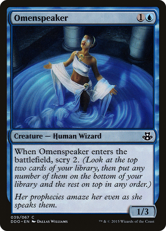 When Omenspeaker enters the battlefield, scry 2. (Look at the top two cards of your library, then put any number of them on the bottom of your library and the rest on top in any order.)