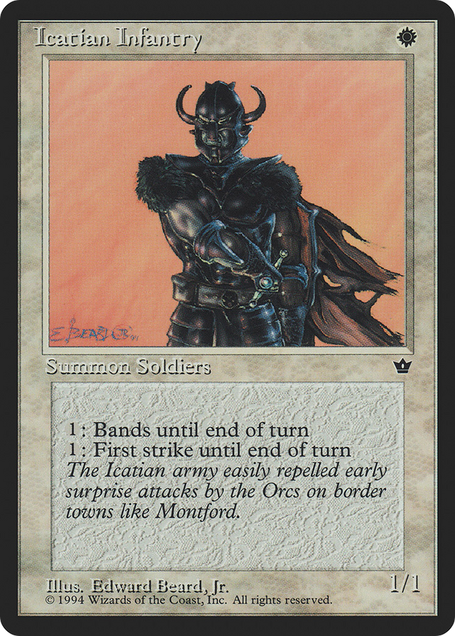 {1}: Icatian Infantry gains banding until end of turn. (Any creatures with banding, and up to one without, can attack in a band. Bands are blocked as a group. If any creatures with banding you control are blocking or being blocked by a creature, you divide that creature's combat damage, not its controller, among any of the creatures it's being blocked by or is blocking.)