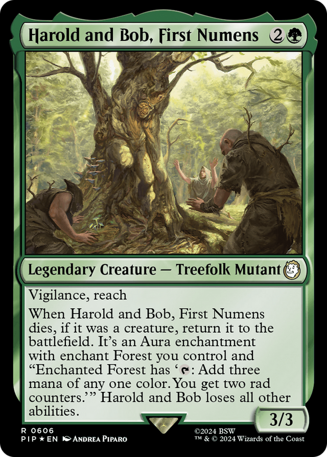 When Harold and Bob, First Numens dies, if it was a creature, return it to the battlefield. It's an Aura enchantment with enchant Forest you control and "Enchanted Forest has '{T}: Add three mana of any one color. You get two rad counters.'" Harold and Bob loses all other abilities.