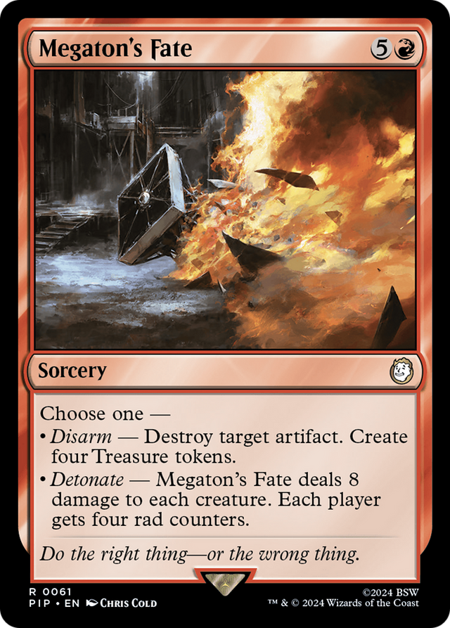 Choose one — • Disarm — Destroy target artifact. Create four Treasure tokens. • Detonate — Megaton's Fate deals 8 damage to each creature. Each player gets four rad counters.