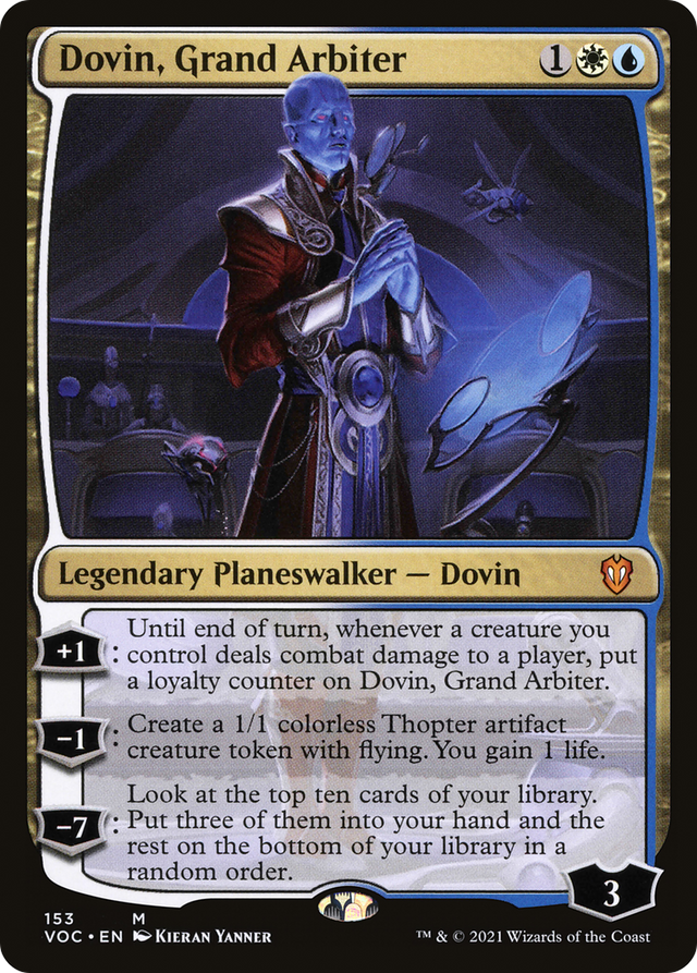 +1: Until end of turn, whenever a creature you control deals combat damage to a player, put a loyalty counter on Dovin, Grand Arbiter. −1: Create a 1/1 colorless Thopter artifact creature token with flying. You gain 1 life. −7: Look at the top ten cards of your library. Put three of them into your hand and the rest on the bottom of your library in a random order.