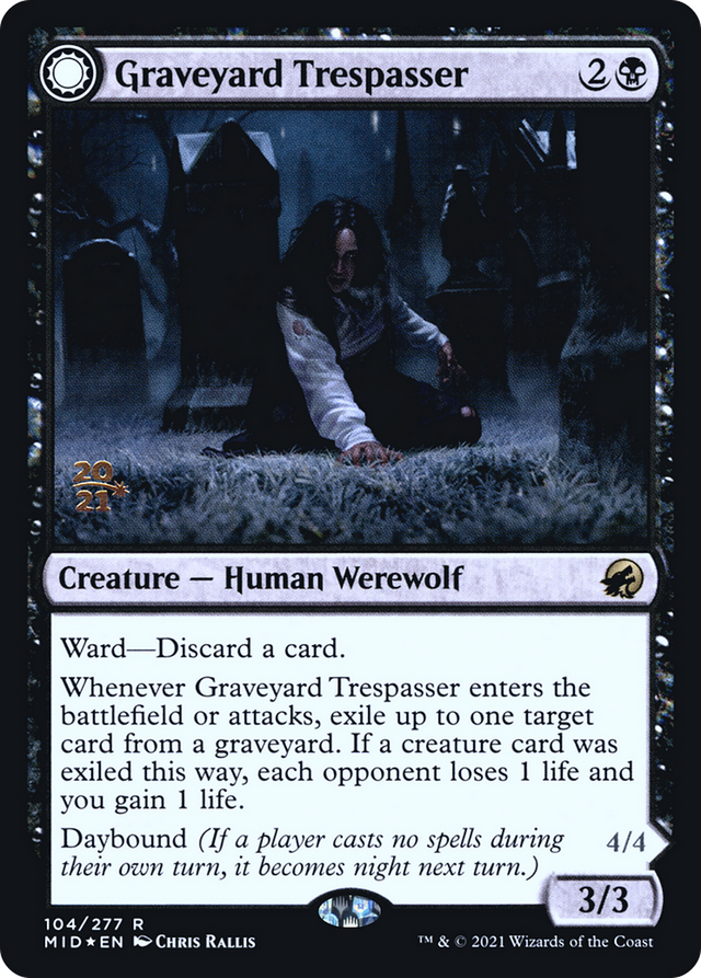 Ward—Discard a card. Whenever Graveyard Trespasser enters the battlefield or attacks, exile up to one target card from a graveyard. If a creature card was exiled this way, each opponent loses 1 life and you gain 1 life. Daybound (If a player casts no spells during their own turn, it becomes night next turn.) // Ward—Discard a card. Whenever Graveyard Glutton enters the battlefield or attacks, exile up to two target cards from graveyards. For each creature card exiled this way, each opponent loses 1 life and you gain 1 life. Nightbound (If a player casts at least two spells during their own turn, it becomes day next turn.)