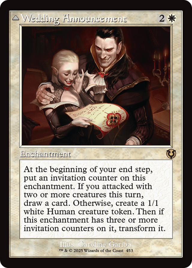 At the beginning of your end step, put an invitation counter on Wedding Announcement. If you attacked with two or more creatures this turn, draw a card. Otherwise, create a 1/1 white Human creature token. Then if Wedding Announcement has three or more invitation counters on it, transform it. // Creatures you control get +1/+1.