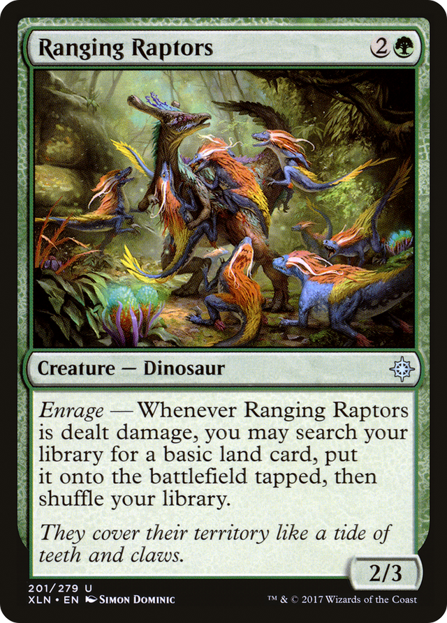 Enrage — Whenever Ranging Raptors is dealt damage, you may search your library for a basic land card, put it onto the battlefield tapped, then shuffle.