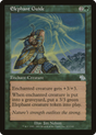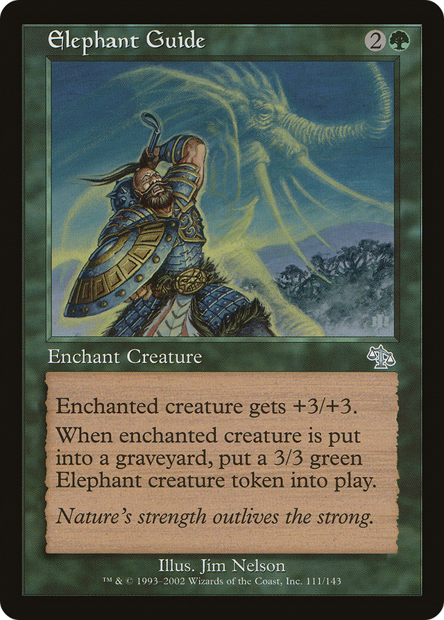 When enchanted creature dies, create a 3/3 green Elephant creature token.