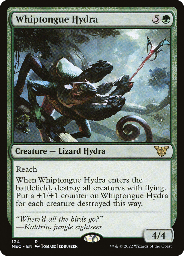 Reach When Whiptongue Hydra enters the battlefield, destroy all creatures with flying. Put a +1/+1 counter on Whiptongue Hydra for each creature destroyed this way.