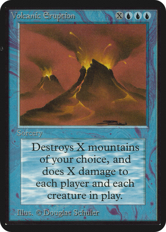 Destroy X target Mountains. Volcanic Eruption deals damage to each creature and each player equal to the number of Mountains put into a graveyard this way.