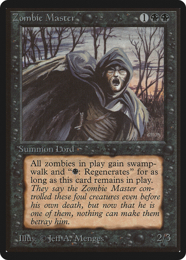 Other Zombie creatures have swampwalk. (They can't be blocked as long as defending player controls a Swamp.) Other Zombies have "{B}: Regenerate this permanent."