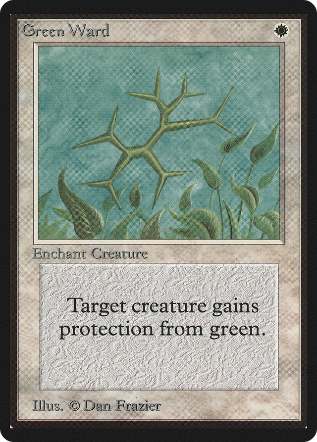 Enchant creature Enchanted creature has protection from green. This effect doesn't remove Green Ward.