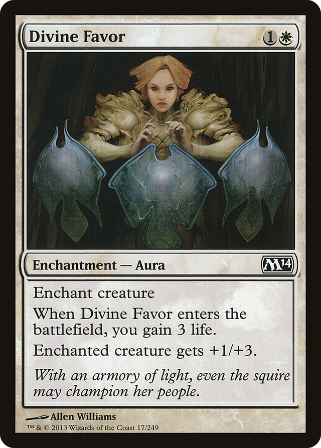 Enchant creature When Divine Favor enters the battlefield, you gain 3 life. Enchanted creature gets +1/+3.