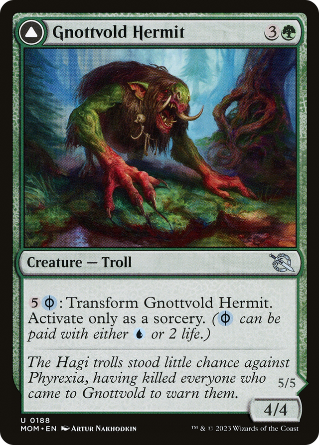 {5}{U/P}: Transform Gnottvold Hermit. Activate only as a sorcery. ({U/P} can be paid with either {U} or 2 life.) // Whenever Chrome Host Hulk attacks, up to one other target creature has base power and toughness 5/5 until end of turn.