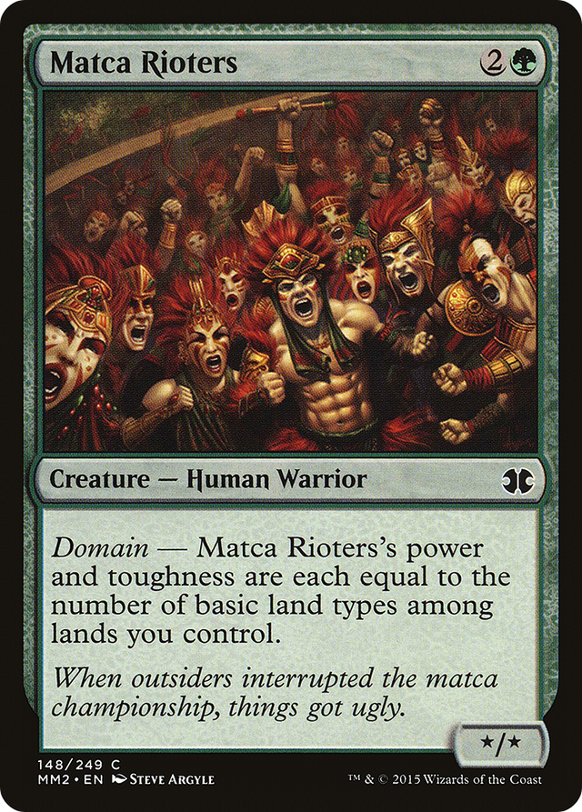Domain — Matca Rioters's power and toughness are each equal to the number of basic land types among lands you control.