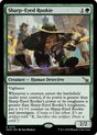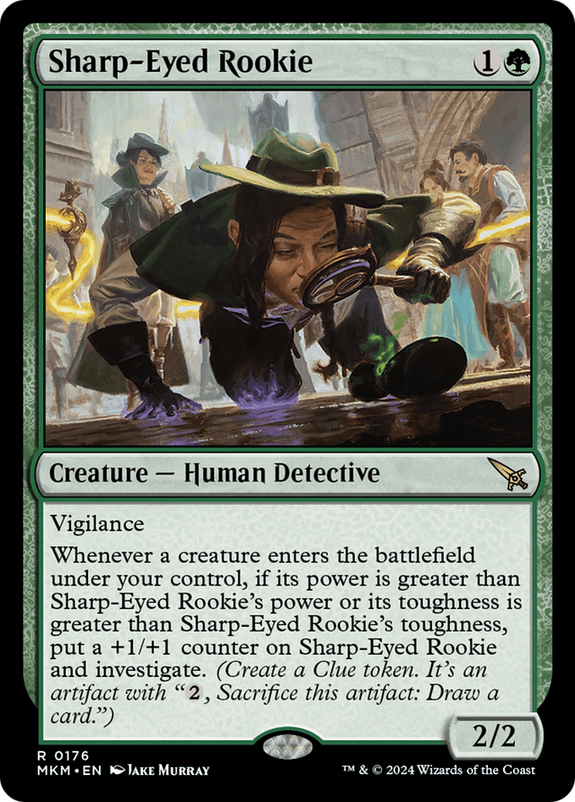 Vigilance Whenever a creature enters the battlefield under your control, if its power is greater than Sharp-Eyed Rookie's power or its toughness is greater than Sharp-Eyed Rookie's toughness, put a +1/+1 counter on Sharp-Eyed Rookie and investigate. (Create a Clue token. It's an artifact with "{2}, Sacrifice this artifact: Draw a card.")