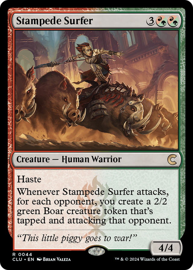 Whenever Stampede Surfer attacks, for each opponent, you create a 2/2 green Boar creature token that's tapped and attacking that opponent.