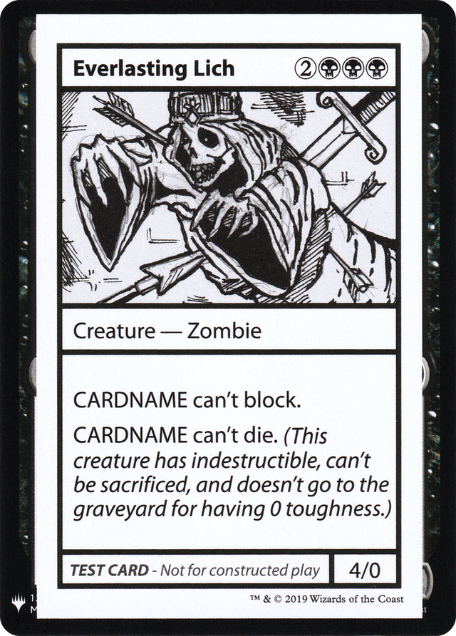 Everlasting Lich can't die. (This creature has indestructible, can't be sacrificed, and doesn't go to the graveyard for having 0 toughness.)