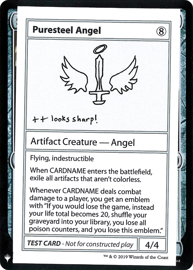 Whenever Puresteel Angel deals combat damage to a player, you get an emblem with "If you would lose the game, instead your life total becomes 20, shuffle your graveyard into your library, you lose all poison counters, and you lose this emblem."
