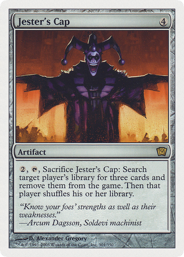{2}, {T}, Sacrifice Jester's Cap: Search target player's library for three cards and exile them. Then that player shuffles.