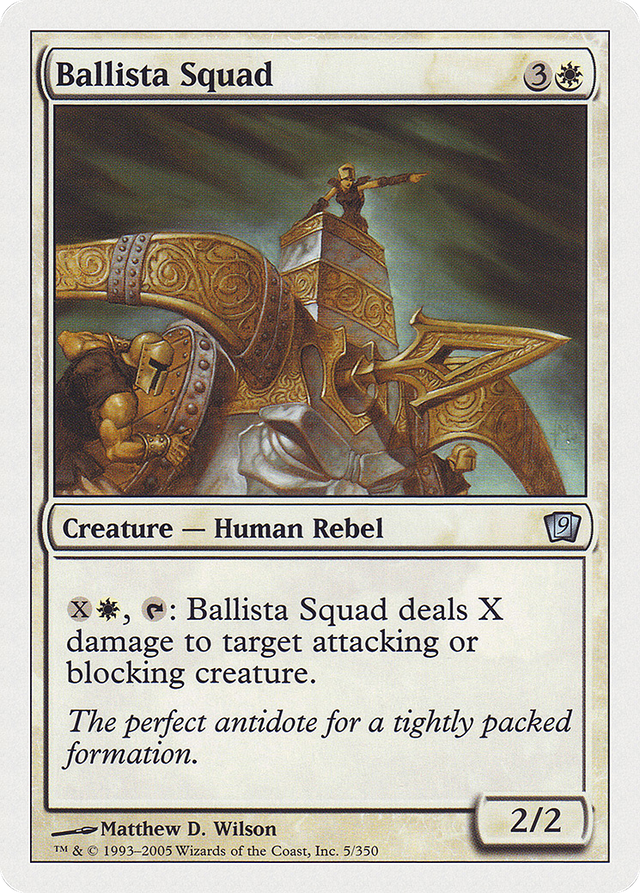 {X}{W}, {T}: Ballista Squad deals X damage to target attacking or blocking creature.