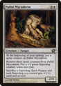 At the beginning of your upkeep, put a spore counter on Pallid Mycoderm. Remove three spore counters from Pallid Mycoderm: Create a 1/1 green Saproling creature token. Sacrifice a Saproling: Each creature you control that's a Fungus or a Saproling gets +1/+1 until end of turn.