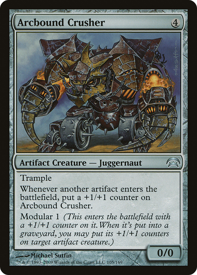 Trample Whenever another artifact enters the battlefield, put a +1/+1 counter on Arcbound Crusher. Modular 1 (This creature enters the battlefield with a +1/+1 counter on it. When it dies, you may put its +1/+1 counters on target artifact creature.)