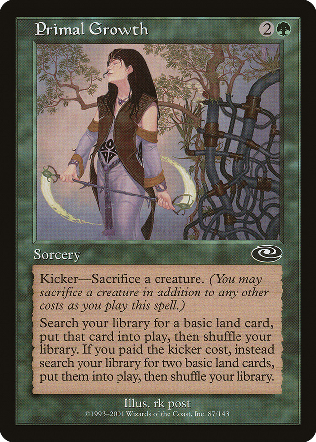 Kicker—Sacrifice a creature. (You may sacrifice a creature in addition to any other costs as you cast this spell.) Search your library for a basic land card, put that card onto the battlefield, then shuffle. If this spell was kicked, instead search your library for up to two basic land cards, put them onto the battlefield, then shuffle.