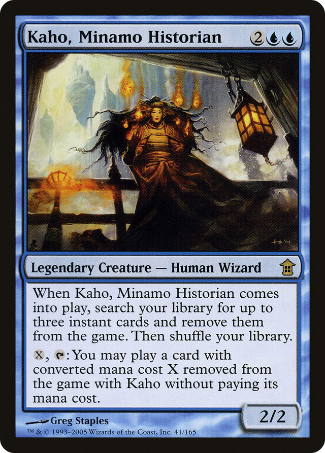 When Kaho, Minamo Historian enters the battlefield, search your library for up to three instant cards, exile them, then shuffle.