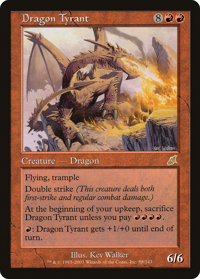 Flying, trample Double strike (This creature deals both first-strike and regular combat damage.) At the beginning of your upkeep, sacrifice Dragon Tyrant unless you pay {R}{R}{R}{R}. {R}: Dragon Tyrant gets +1/+0 until end of turn.