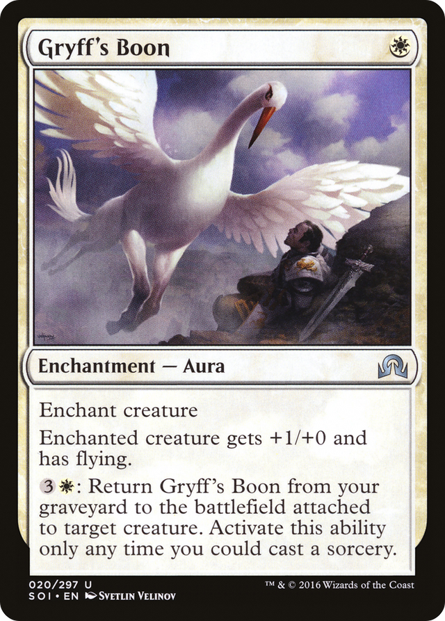 Enchant creature Enchanted creature gets +1/+0 and has flying. {3}{W}: Return Gryff's Boon from your graveyard to the battlefield attached to target creature. Activate only as a sorcery.