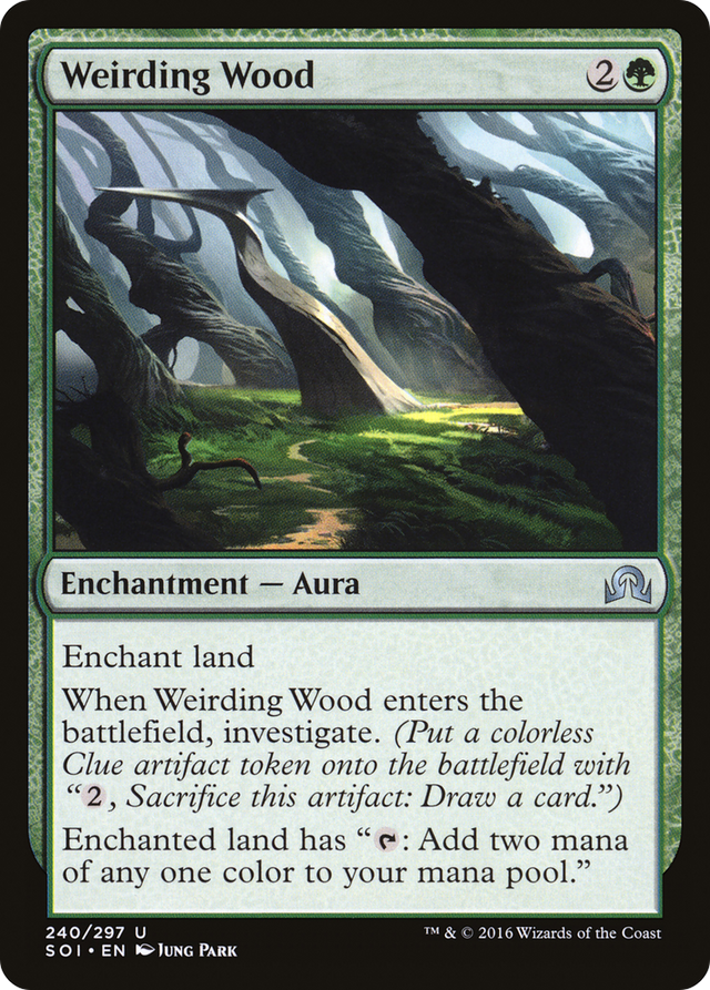 When Weirding Wood enters the battlefield, investigate. (Create a Clue token. It's an artifact with "{2}, Sacrifice this artifact: Draw a card.")