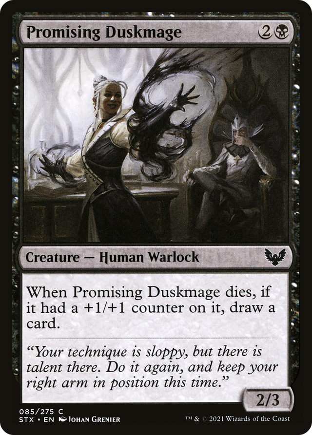 When Promising Duskmage dies, if it had a +1/+1 counter on it, draw a card.
