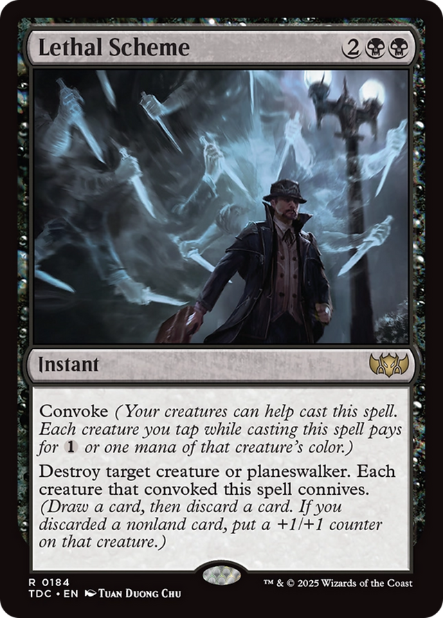 Convoke (Your creatures can help cast this spell. Each creature you tap while casting this spell pays for {1} or one mana of that creature's color.) Destroy target creature or planeswalker. Each creature that convoked Lethal Scheme connives. (Draw a card, then discard a card. If you discarded a nonland card, put a +1/+1 counter on that creature.)