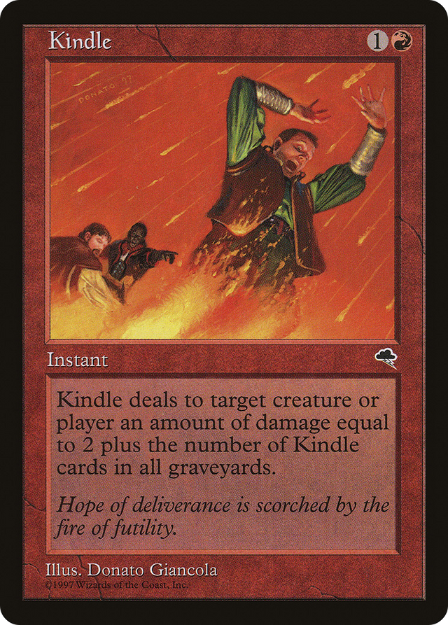 Kindle deals X damage to any target, where X is 2 plus the number of cards named Kindle in all graveyards.