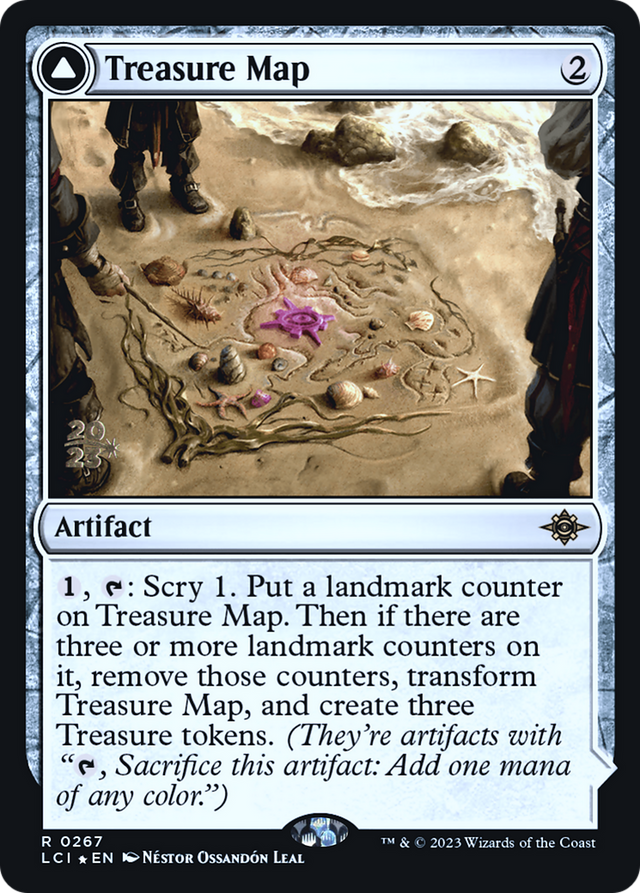 {1}, {T}: Scry 1. Put a landmark counter on Treasure Map. Then if there are three or more landmark counters on it, remove those counters, transform Treasure Map, and create three Treasure tokens. (They're artifacts with "{T}, Sacrifice this artifact: Add one mana of any color.") // (Transforms from Treasure Map.)