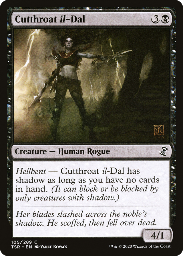 Hellbent — Cutthroat il-Dal has shadow as long as you have no cards in hand. (It can block or be blocked by only creatures with shadow.)