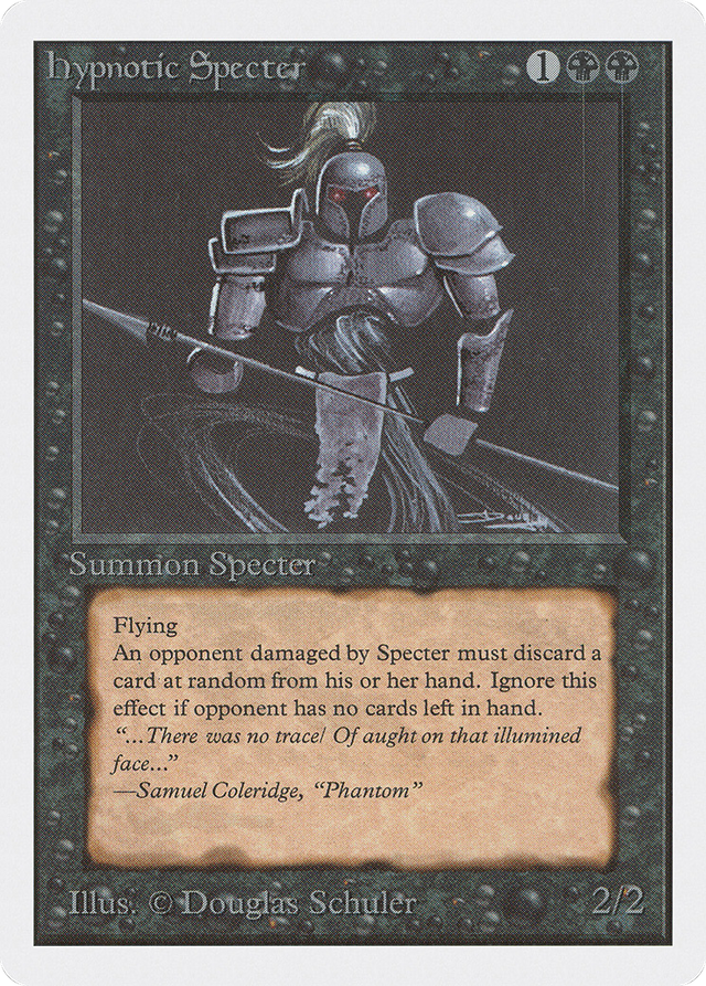 Whenever Hypnotic Specter deals damage to an opponent, that player discards a card at random.