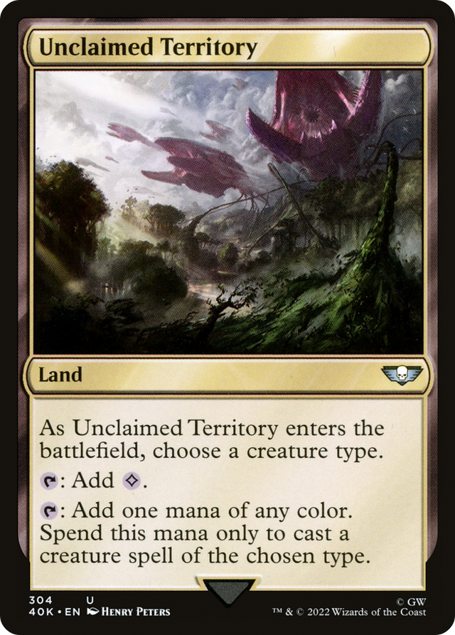 As Unclaimed Territory enters the battlefield, choose a creature type. {T}: Add {C}. {T}: Add one mana of any color. Spend this mana only to cast a creature spell of the chosen type.