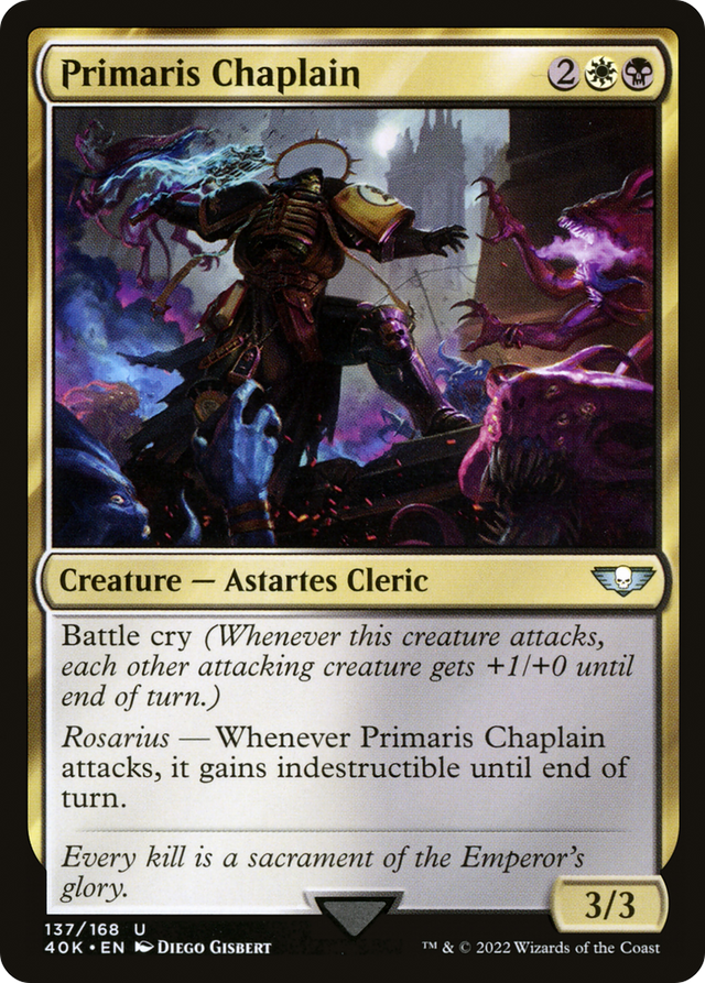 Battle cry (Whenever this creature attacks, each other attacking creature gets +1/+0 until end of turn.) Rosarius — Whenever Primaris Chaplain attacks, it gains indestructible until end of turn.