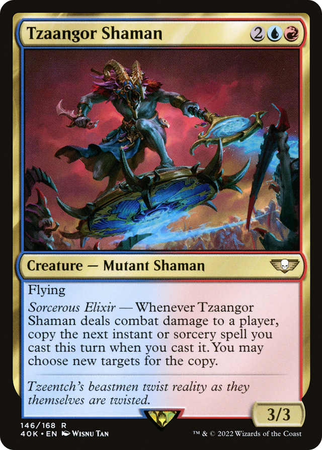 Sorcerous Elixir — Whenever Tzaangor Shaman deals combat damage to a player, copy the next instant or sorcery spell you cast this turn when you cast it. You may choose new targets for the copy.