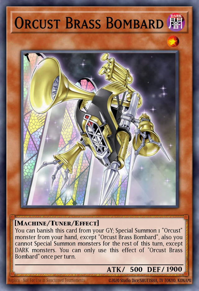 You can banish this card from your GY; Special Summon 1 "Orcust" monster from your hand, except "Orcust Brass Bombard", also you cannot Special Summon monsters for the rest of this turn, except DARK monsters. You can only use this effect of "Orcust Brass Bombard" once per turn.