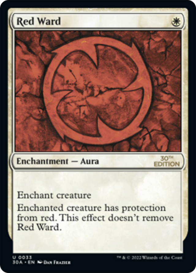 Enchanted creature has protection from red. This effect doesn't remove Red Ward.
